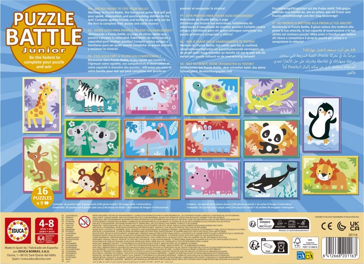 Zabawne i emocjonujące wyzwanie puzzlowe dla dzieci i dorosłych! Educa puzzle bitwa Zwierzątka łączy klasyczne układanie z wyścigowym pojedynkiem, który sprawdzi spostrzegawczość i koncentrację. W opakowaniu znajduje się 16 mini puzzli po 9 elementów oraz 16 kart wzorcowych – idealne na rodzinne turnieje oraz trening koordynacji ręka–oko, cierpliwości i umiejętności obserwacji.