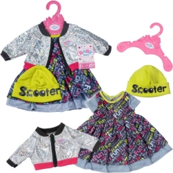 Wyrusz do miasta w wielkim stylu. Ten zestaw dla lalki BABY BORN 43 cm łączy elegancką, warstwową sukienkę z wyrazistym nadrukiem liter, błyszczącą kurtkę ze srebrnym wzorem i kontrastowymi mankietami oraz praktyczną żółtą czapkę, która chroni fryzurę pod kaskiem podczas jazdy na skuterze.