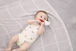 Tekstylny pierścień z antypoślizgową strukturą łatwo trzymają dzieci i pomaga rozwijać małą motorykę.