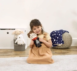 Ten oficjalnie inspirowany pluszak nosi kultowy czarny płaszcz oraz czerwono‑żółty (gryfoński) szalik, które wraz z okrągłymi okularami i blizną w kształcie błyskawicy wiernie przypominają ulubionego czarodzieja. Doskonale nadaje się do stymulacji zmysłów i kojących rytuałów przed snem.