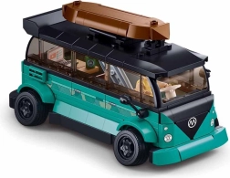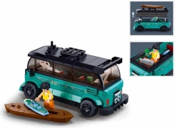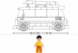 Zestaw oferuje szczegółowy model samochodu surfingowego z realistycznymi elementami, takimi jak okna, koła i dachowy bagażnik.