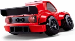 W zestawie znajduje się szczegółowy samochód wyścigowy z elementami podkreślającymi szybkość, takimi jak tylny spoiler i solidne opony.
