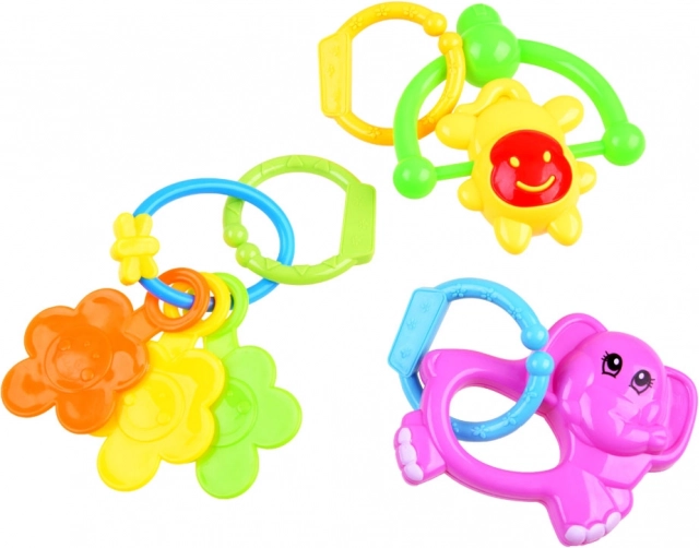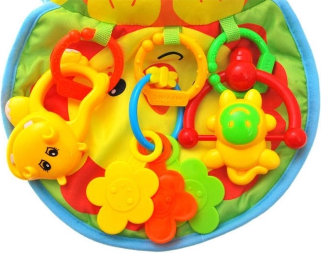 Kolorowa szeleszcząca mini podkładka i odpinane grzechotki wspierają rozwój wzroku, słuchu i małej motoryki.