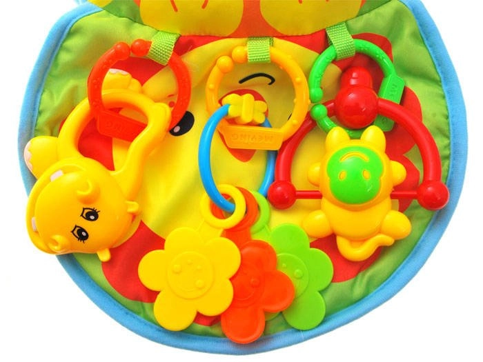 - Stymulacja zmysłów: szeleszcząca podkładka i grzechotki rozwijają słuch, dotyk i wzrok.