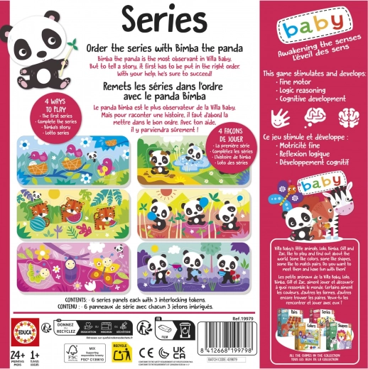 Zabawna i edukacyjna układanka dla najmłodszych od 24 miesięcy marki EDUCA. Zestaw zawiera 6 prostych puzzli po 3 elementy z motywem sympatycznej pandy Bimby i jej przyjaciół. Wspiera motorykę małą, uwagę, ciekawość oraz wyobraźnię dzieci. Duże i solidne elementy ułatwiają chwytanie i układanie, nauka odbywa się w formie zabawy.