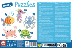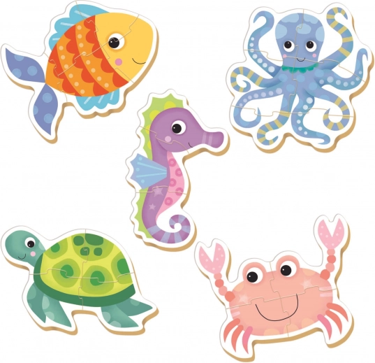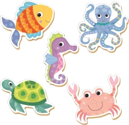 Rybka, ośmiornica, konik morski, żółw i krab w żywych kolorach przyciągają uwagę i motywują do układania.