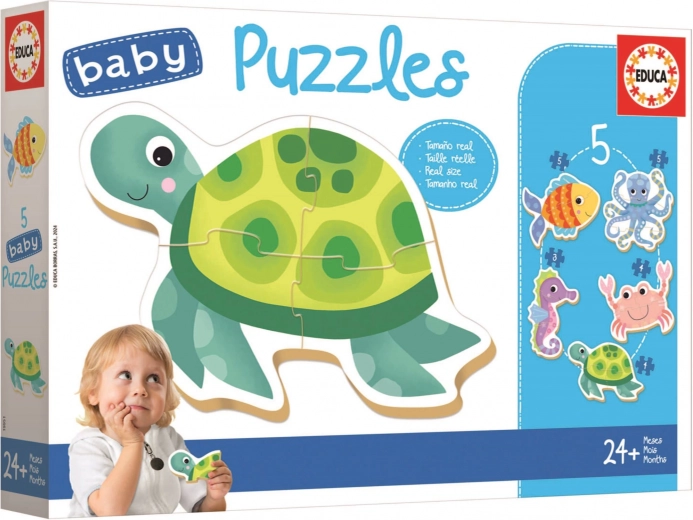 Baby puzzle EDUCA Zwierzęta wodne 5w1 zostały zaprojektowane specjalnie dla najmłodszych. Wspierają rozwój psychomotoryczny, koordynację ręka–oko oraz cierpliwość i logiczne myślenie. Ułożony obrazek ma około 15 × 15 cm – idealny rozmiar dla małych rąk i pierwszych sukcesów.