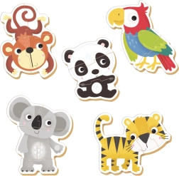 Odkryj zabawne obrysowe baby puzzle dla najmłodszych od 24 miesięcy. Zestaw zawiera 5 progresywnych układanek z motywami dzikich zwierząt (3–5 elementów). Duże i solidne elementy są łatwe do trzymania, wspierają motorykę małą, koncentrację i wyobraźnię.