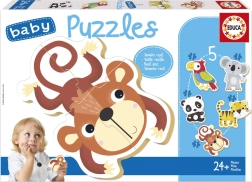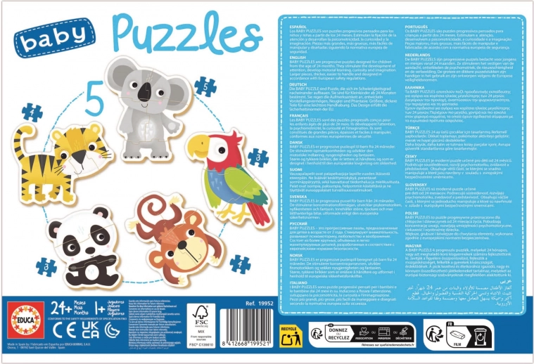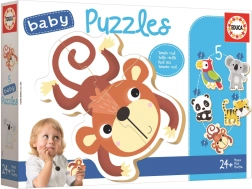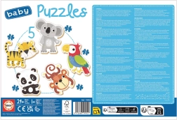 Educa baby puzzle Dzikie zwierzęta 5w1 są specjalnie zaprojektowane dla małych dzieci, które dopiero zaczynają przygodę z puzzlami. Dzięki stopniowo większej liczbie elementów (od 3 do 5) dzieci w zabawny sposób budują pewność siebie i cierpliwość. Duże i grube elementy łatwo się chwytają i dokładnie do siebie pasują.