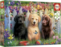 Trzy wesołe szczenięta w barwnym ogrodzie z kwiatami i motylami przyciągają uwagę i motywują do układania.