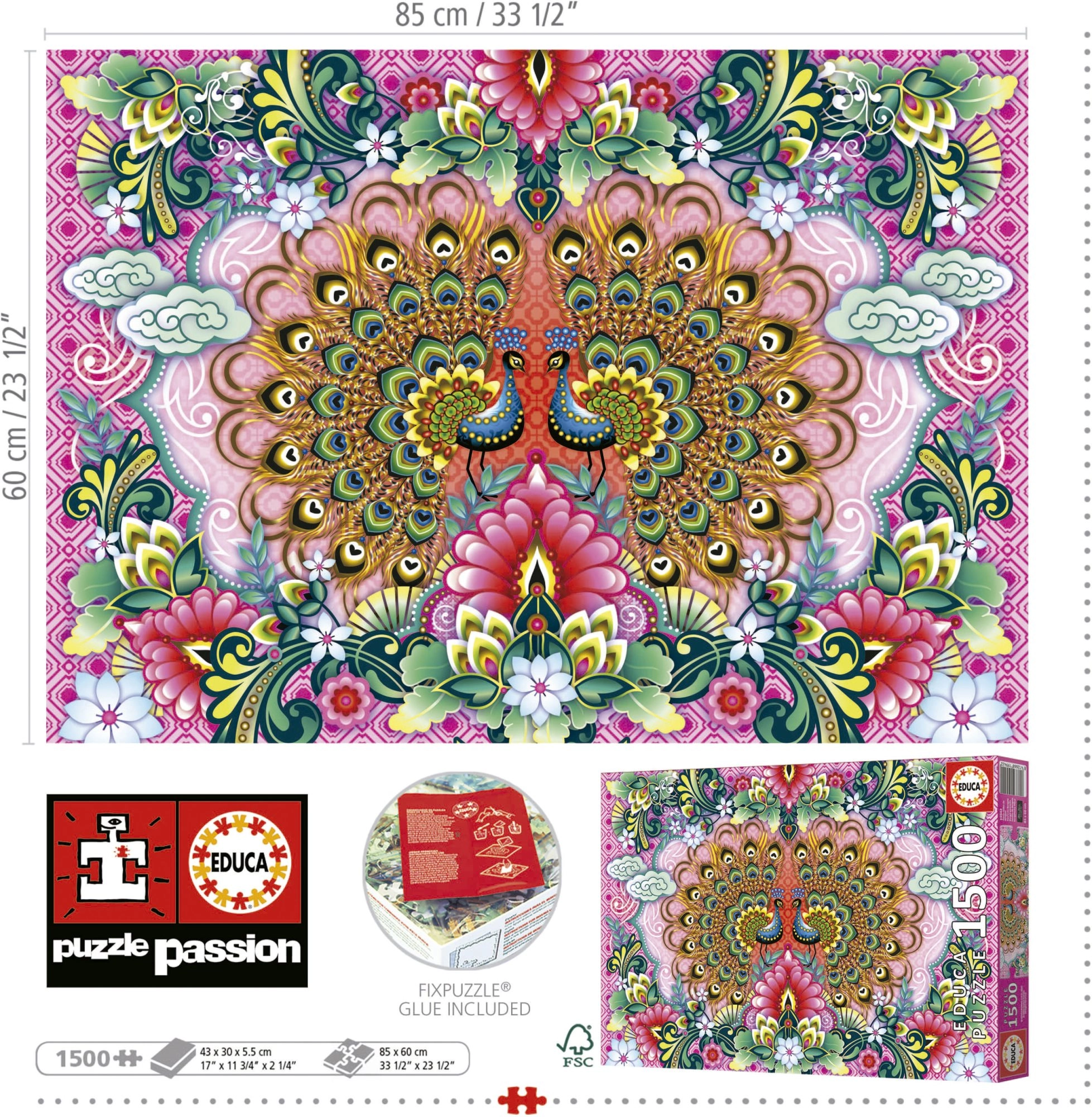 Ciesz się relaksem i wyzwaniem z pięknym motywem pawi na wysokiej jakości puzzlach z 1500 elementami. W zestawie znajduje się klej gratis do łatwego utrwalenia gotowego obrazu. Po ułożeniu puzzle mają wymiary ok. 85 × 60 cm, idealne do oprawienia w ramę.