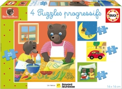 Zestaw 4 w 1 oferuje stopniowo rosnący poziom trudności – od 12 aż do 25 elementów. Dzięki temu dzieci łatwo budują pewność siebie i umiejętności, gdy pojedyncze części stają się mniejsze, a poziom trudności rośnie. Uroczy motyw Petit Ours Brun bawi i motywuje do wielokrotnego układania.