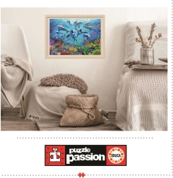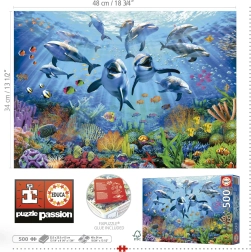 Wyrusz na podwodną przygodę! Puzzle Zabawa pod wodą oferuje 500 elementów pełnych kolorowego świata pod powierzchnią. Ciesz się większą frajdą z dołączonym klejem za darmo do łatwego zachowania ułożonej sceny.