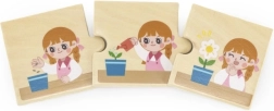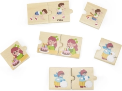 Ta drewniana układanka firmy VIGA daje dziecku możliwość ułożenia 8 kolorowych zestawów puzzli przedstawiających różne czynności dzieci w ich codziennym życiu. Zawiera popularne aktywności, takie jak mycie rąk, bieganie czy zdmuchiwanie świeczek na torcie.