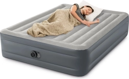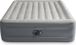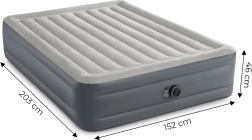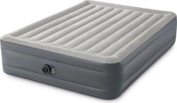 Premiumowy materac dmuchany INTEX jest idealny dla gości, do użytku domowego i na kemping. Podwyższona konstrukcja o wysokości 46 cm ułatwia wstawanie, a wytrzymałe PVC z wodoodporną welurową powierzchnią zapewnia komfort i długą żywotność. Wbudowana pompka 220–240 V przygotuje łóżko do użycia w około 250 sekund.