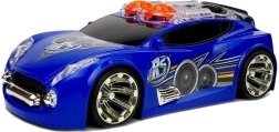 Sportowy samochód DJ łączy muzykę, światła i akcję. Dwa pomarańczowe przyciski na dachu sterują odtwarzaniem melodii i dźwiękiem szybkiego przyspieszenia, a głośniki na dachu naprzemiennie poruszają się w rytm. Dzięki efektownym światłom i sportowym naklejkom auto wygląda energicznie i przyciąga uwagę każdego małego kierowcy.
