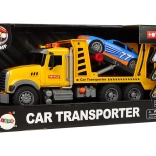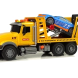 Żółty plastikowy holownik z dopracowanymi detalami pozwala dzieciom realistycznie przewozić auta. Po naciśnięciu pomarańczowego przycisku rampa się podnosi, a dolnym przyciskiem można ją opuścić. Zintegrowane dociskowe kółko blokuje koła i zabezpiecza samochodzik przed zjazdem.