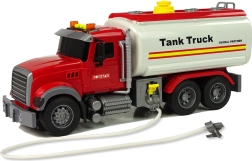 Dodatkowe funkcje, takie jak efekty dźwiękowe i świetlne, dodają całej zabawie realizmu i efektu. Syreny ostrzegawcze na górze sygnalizują ruch, a przyciski u góry odpowiadają za dźwięki – klakson, uruchamianie silnika, cofanie. Dzięki czerwono-białej kolorystyce auto będzie widoczne z daleka. Cysterna ma napęd cierny tylnej osi typu push-pull – wystarczy nacisnąć tylną część, puścić do przodu i cieszyć się prędkością.