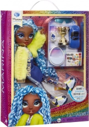 Seria Sparkle & Shine prezentuje inny rodzaj tęczy, która pojawia się tylko nocą – rzadką, wyjątkową i olśniewającą. Lalka Marina z edycji RAINBOW HIGH zachwyca czarującym wyglądem, wyrazistym stylem i niezwykłym elementem: nogami wypełnionymi brokatem, które tworzą hipnotyzujący efekt przy każdym ruchu.
