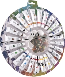 Kompletny zestaw farb akrylowych z paletą dla początkujących i zaawansowanych. Zawiera 24 odcienie po 12 ml z żywymi pigmentami, wysokim kryciem i szybkim schnięciem. Farby są łatwe do mieszania, rozcieńczalne wodą i po wyschnięciu tworzą trwały, wodoodporny film. Odpowiednie na płótno, papier, drewno, ceramikę i tekstylia.