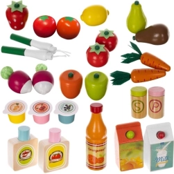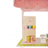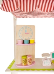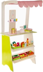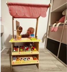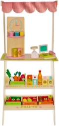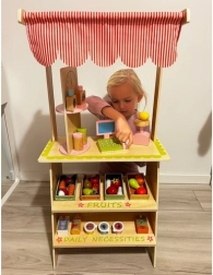 Podaruj dzieciom własny targ! Stylowe drewniane stoisko z daszkiem w paski, półkami i oznaczonymi sekcjami na owoce i artykuły codziennego użytku rozwija wyobraźnię, komunikację i motorykę małą. Realistyczne akcesoria – kasa ze skanerem, karta płatnicza, waga oraz obrotowa tablica/„zegar” – zamienią każdy zakup w wciągającą przygodę.