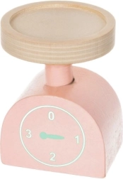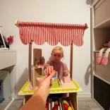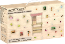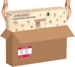 Konstrukcja z litego drewna i MDF jest stabilna, trwała i dostosowana do małych rączek. Wszystkie elementy mają gładkie, zaokrąglone krawędzie i spełniają europejskie normy bezpieczeństwa zabawek. Dzięki kompaktowym wymiarom i przemyślanemu układowi stoisko pasuje do pokoju dziecięcego i kącika zabaw.