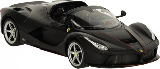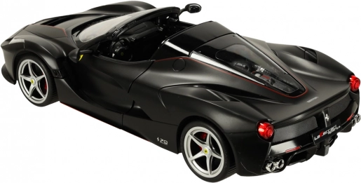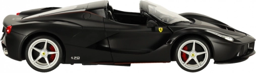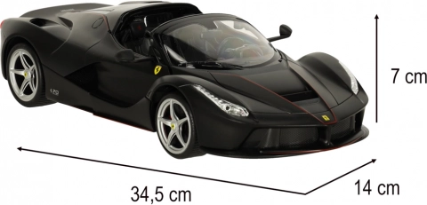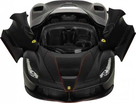 Ta wierna replika FERRARI LaFerrari Aperta zachwyca precyzyjnymi detalami nadwozia, sportowymi kołami i autentycznymi proporcjami. Czarna kolorystyka z emblematami marki podkreśla ekskluzywny wygląd supersamochodu.