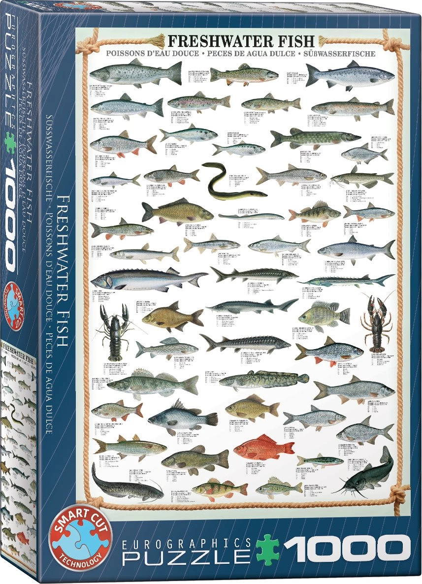 Zanurz się w świecie ryb słodkowodnych i skorupiaków z tym wyjątkowym puzzle. Każdy obrazek uzupełniony jest łacińską nazwą, przeciętną wagą i długością oraz nazwami w czterech innych językach: angielskim, francuskim, hiszpańskim i niemieckim.