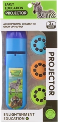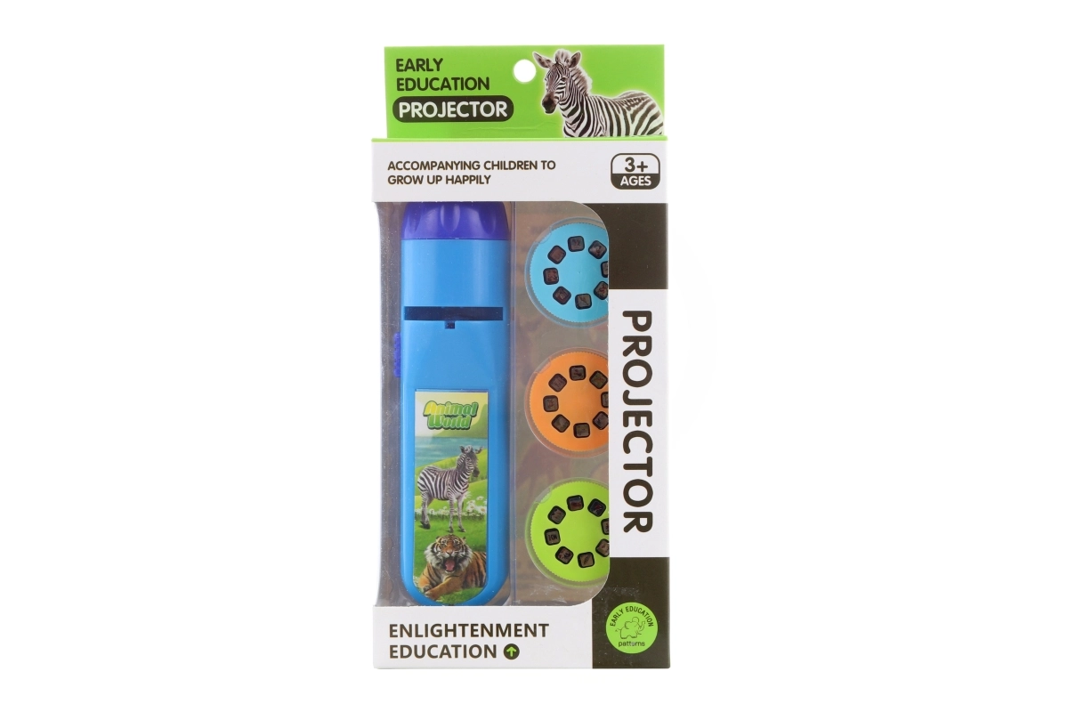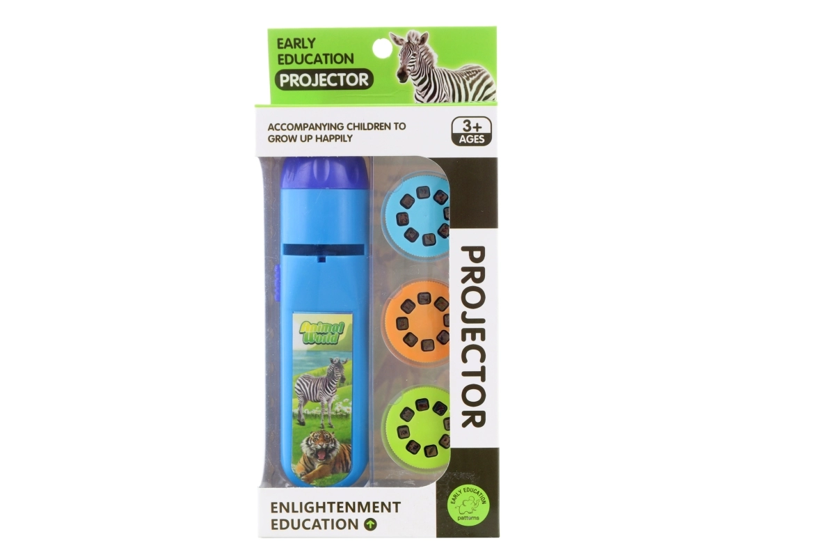 Plastowy projektor na baterie. W zestawie znajdują się 3 krążki ze zdjęciami (łącznie 24 obrazki). Po naciśnięciu przycisku projektor wyświetla obrazki na ścianie (lub innej białej powierzchni). Zasilanie na 3 baterie AG13 (w zestawie). Wymiary projektora ok. 13 × 3,5 cm. Wymiary opakowania ok. 9,5 × 20,5 × 4 cm. Wiek 3+