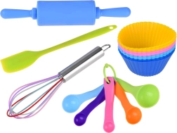 Zawiera wałek, trzepaczkę, szpatułkę, foremki do ciastek i muffinek oraz inne przydatne dodatki do zabawy podczas pieczenia.