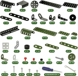 W opakowaniu znajdziesz wszystko, czego potrzeba do złożenia modelu, w tym metalowe i plastikowe elementy, narzędzia i naklejki.