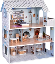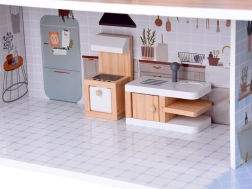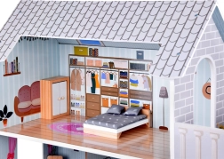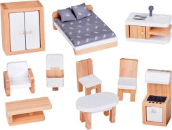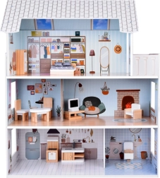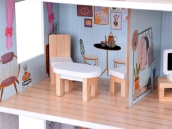 W zestawie znajduje się bogaty komplet mebli, dzięki któremu można łatwo aranżować poszczególne pomieszczenia. Konstrukcja z wytrzymałego drewna, gładkie krawędzie oraz nietoksyczne materiały gwarantują bezpieczną zabawę. Montaż jest szybki i intuicyjny – elementy są ponumerowane, a ilustrowana instrukcja prowadzi krok po kroku.