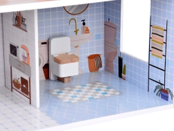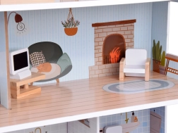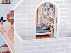Ta stylowa drewniana willa dla lalek oferuje trzy piętra zabawy i mnóstwo miejsca na wyobraźnię. Dzieci odkryją kuchnię, łazienkę, salon, jadalnię oraz przestronną sypialnię z balkonem. Realistyczne tapety, podłogi i drobne dekoracje w pastelowych kolorach tworzą przytulną atmosferę dla niekończących się opowieści.