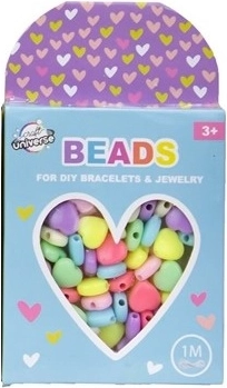 Zestaw kolorowych koralików w pięknym papierowym pudełku; w zestawie znajduje się także sznurek o długości 1 metra do nawlekania. Koraliki można łatwo nawlekać i tworzyć bransoletki oraz naszyjniki – dla siebie lub dla koleżanek i kolegów. Można je łączyć z innymi rodzajami koralików z kolekcji (12 rodzajów).