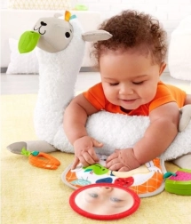 - Lama, miękki wałek podpierający, dwustronna mini-mata z kieszenią, 3 zabawki (lusterko, grzechotka arbuz, gryzak marchewka)