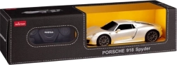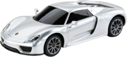 Srebrny model Porsche 918 Spyder wiernie oddaje luksusowy wygląd prawdziwego samochodu, w tym sportowy design i szczegółowe elementy.