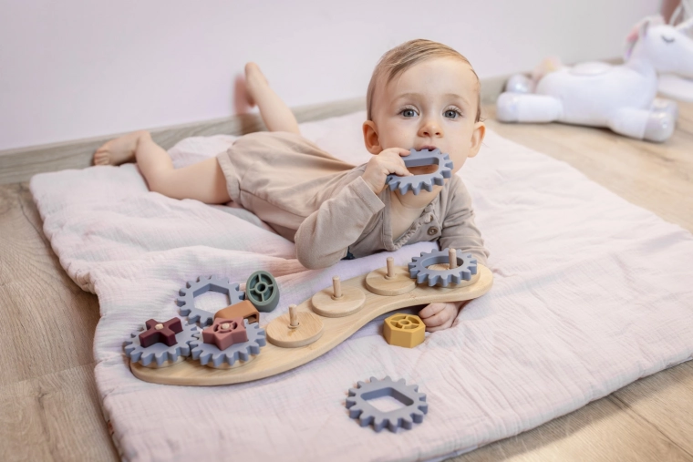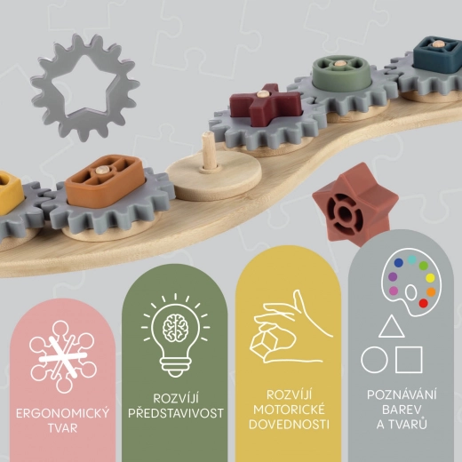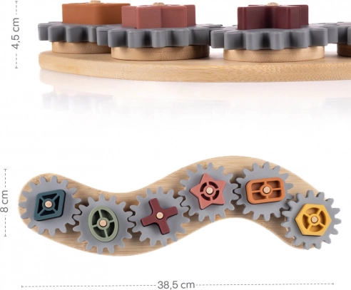 Odkryj magię nauki z naszą bambusowo-silikonową układanką, która łączy zabawę z poznawaniem. Kolorowe zębate kółka rozwijają małą motorykę, logiczne myślenie i wyobraźnię Twojego dziecka. Połączenie naturalnego bambusa i bezpiecznego silikonu zapewnia przyjemne doznania sensoryczne i wspiera naturalne odkrywanie świata mechaniki.