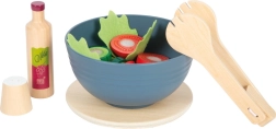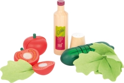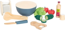 Ten nowoczesny zestaw sałatkowy wykonany jest z wysokiej jakości drewna w połączeniu z realistycznymi kolorami. Zawiera wszystko, co potrzebne do przygotowania sałatki: drewnianą miskę, pokrywkę służącą jako deska do krojenia, ogórek, pomidora, główkę sałaty, tarkę, szczypce, buteleczkę z dressingiem, solniczkę, nóż i obieraczkę do warzyw.