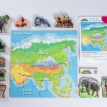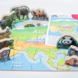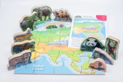 Drewniane puzzle z motywem Azji i jej zwierząt to świetne narzędzie edukacyjne, które umożliwia dzieciom w zabawny sposób poznawać kontynenty i ich faunę. Zawiera 16 elementów do układania mapy oraz 10 wolnostojących zwierząt, realistycznie przedstawionych.