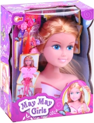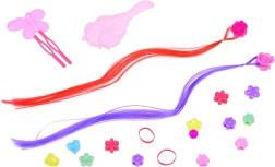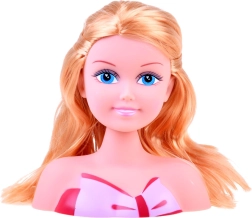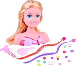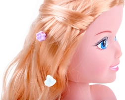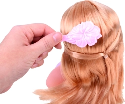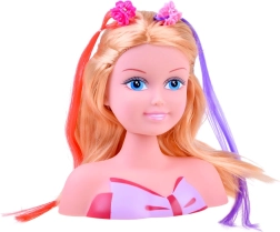 Elegancka głowa do czesania z długimi blond włosami oraz akcesoriami do tworzenia fryzur z pewnością spodoba się każdemu małemu fryzjerowi. Modelka ma długie blond włosy, do jej stylizacji wykorzystuje się dwa kolorowe pasma - fioletowe i czerwone. Spinki, koraliki do plecenia będą ozdabiać każdą fryzurę stworzoną przez stylistkę.