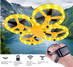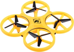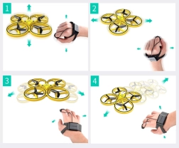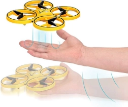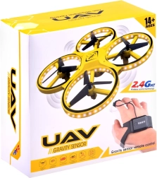 Kwadrokopter UAV Gravity Sensor  - jest zabawną propozycją dla dzieci w różnym wieku, które lubią latające zabawki. Dron jest w całości wykonany z plastiku, z fantastycznym oświetleniem LED, które doskonale prezentuje się w ciemności. Sterowanie odbywa się za pomocą specjalnego zdalnego sterowania, które przypina się do ręki jak zegarek. Sterowany jest za pomocą rąk, gestami. Zabawka ma szerokie możliwości manewrowania, wystarczy delikatny ruch ręką, aby zmienić kierunek lotu na prawo, lewo, w górę lub w dół. Po wypuszczeniu pozostaje w powietrzu i obraca się wokół swojej osi o 360 stopni. Pilot ma być noszony na ręce, suwak na palcu środkowym oraz pasek z przyciskiem na wskazującym palcu. Silikonowy pasek ma 12 stopni regulacji szerokości, więc pasuje każdemu. Zabawka jest lekka, dzięki czemu szybko unosi się w powietrze, 4 przeciwne skrzydła zwiększają jej stabilność podczas lotu. Jak to działa: