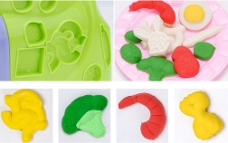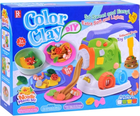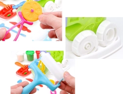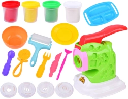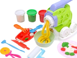 W opakowaniu znajdziesz wszystko, czego potrzeba do realistycznej zabawy w gotowanie: wałeczek, nożyk, widelec, łyżeczkę, krajalnicę do pizzy, szpatułkę, miseczkę, talerz i talerzyk z przegródkami. Cztery kubeczki masy (każdy ok. 60 g) w podstawowych kolorach rozwijają percepcję barw i kreatywność.