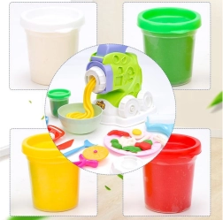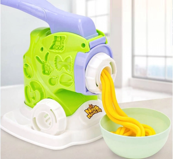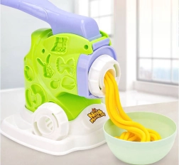 Wystarczy nacisnąć dźwignię, a do miseczki trafią „kluski” lub inne kształty z masy. Prasa jest stabilna, łatwa w obsłudze i daje dzieciom szybki efekt, który motywuje do dalszego tworzenia.
