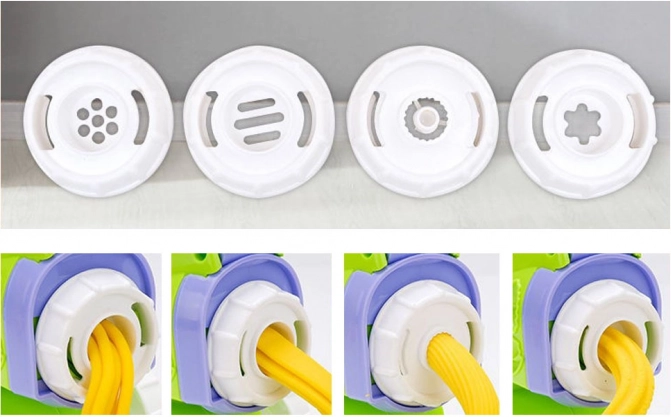 Zmieniaj dysze i twórz spaghetti, tagliatelle, kwiatowe wzory oraz churros. Nasadki łatwo się zakłada i poszerzają możliwości zabawy i nauki.