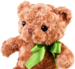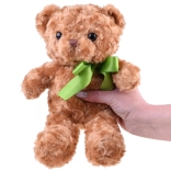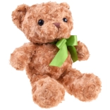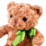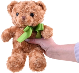Błyszczące czarne oczy, mały brązowy nosek i wyrazista zielona kokarda nadają zabawce charakterystyczny i przyjazny wygląd.