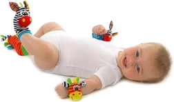 Grzechoczące skarpetki i opaski zachęcają do kopania i machania rączkami, naturalnie wspierając motorykę i koordynację ruchową.