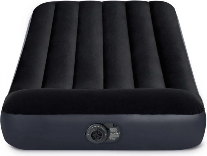 Ciesz się wygodnym snem gdziekolwiek jesteś. Ten jednoosobowy nadmuchiwany materac INTEX łączy wytrzymałe PVC z przyjemnym, wodoodpornym welurem, który zapobiega ślizganiu się prześcieradła i zwiększa komfort. Wbudowana pompka oszczędza czas – materac napompuje się w mgnieniu oka i równie łatwo można go spuścić.