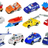 W zestawie są radiowóz policyjny, ratownicy, wóz strażacki z wysuwną drabiną, autobus, pojazdy robocze oraz przyczepy z bagażem i łodzią.