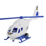 Biało-niebieski śmigłowiec, figurki załogi i pasażerów, znaki, szlabany, palmy i inne elementy budujące wierną atmosferę lotniska.