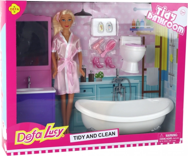 - Lalka w różowym szlafroku, biała wanna, toaleta z różową klapą, umywalka z lustrem, ręcznik, szczotka, suszarka, różowe buty na obcasie (dodatkowa para)